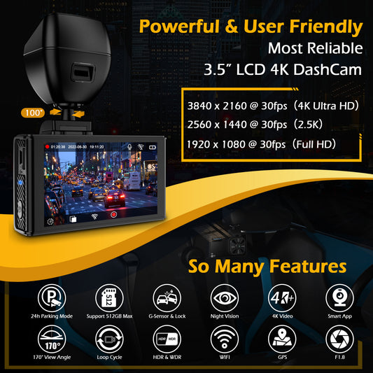 ONDASHCAM O3 4K Dash Cam with Built-in WiFi GPS, 2160P UHD Dash Camera for Cars, 3.5" LCD Dashcam for Cars with 32GB Card, 170° Wide Angle, WDR, Night Vision, G-Sensor, Parking Mode, Support 512GB Max